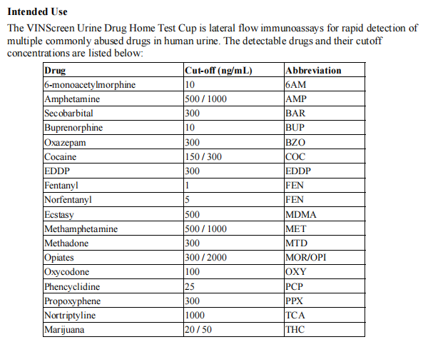 VINScreen Urine Drug Home Test Cup主要采用天然免疫层析法,可怏速测量躯干尿水中18项常用错用药物剂量/代谢转化物。