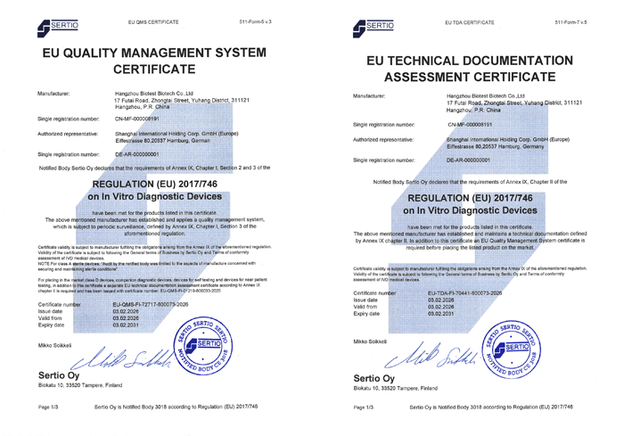 Sertio Oy算作欧洲联盟IVDR管方许可的公司公告组织 ,其发证的教育部认证遵循中国政府公信力。我县厂品圆满获证,不只是是对博拓怪物出产制造潜力、出产质控水平面的超高教育部认证,更突显了公司厂品与国际英文高要求的全部对接,为后面拓展训练中国整个市场奠定知识基础了强有力的合规性知识基础。
